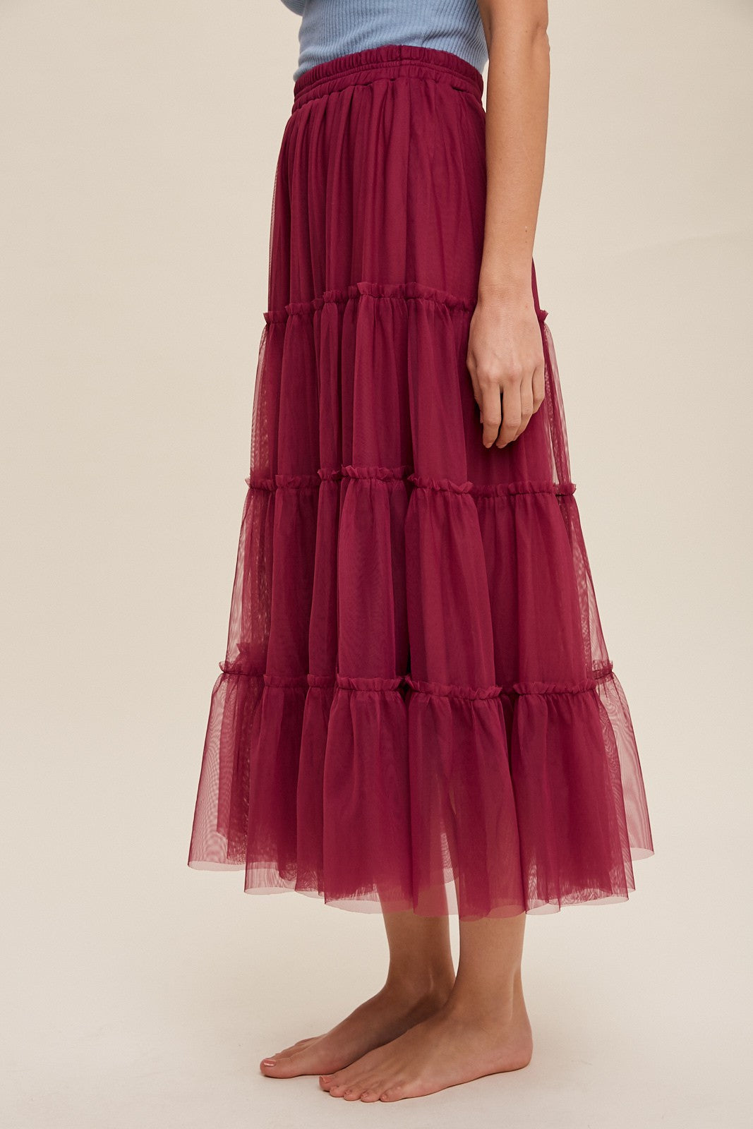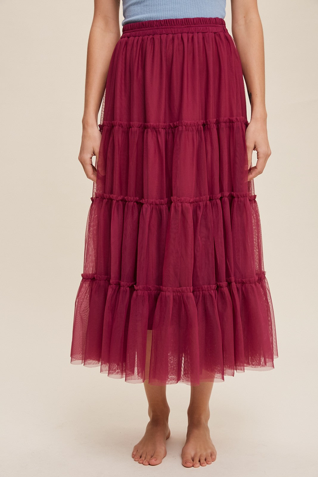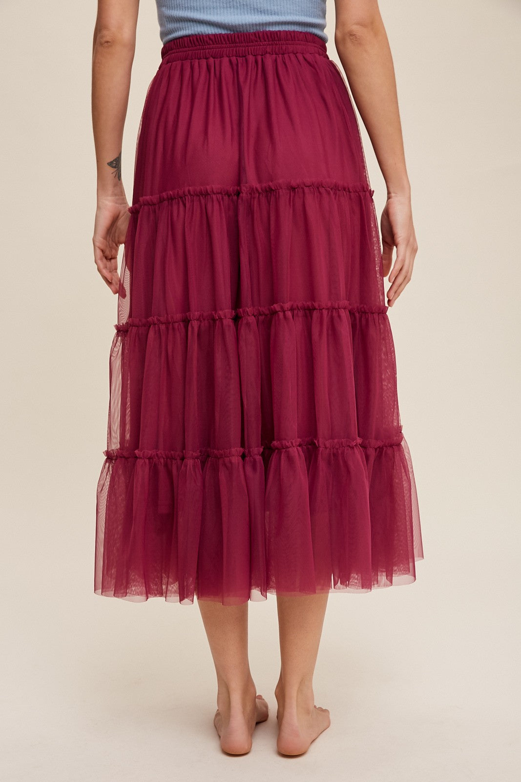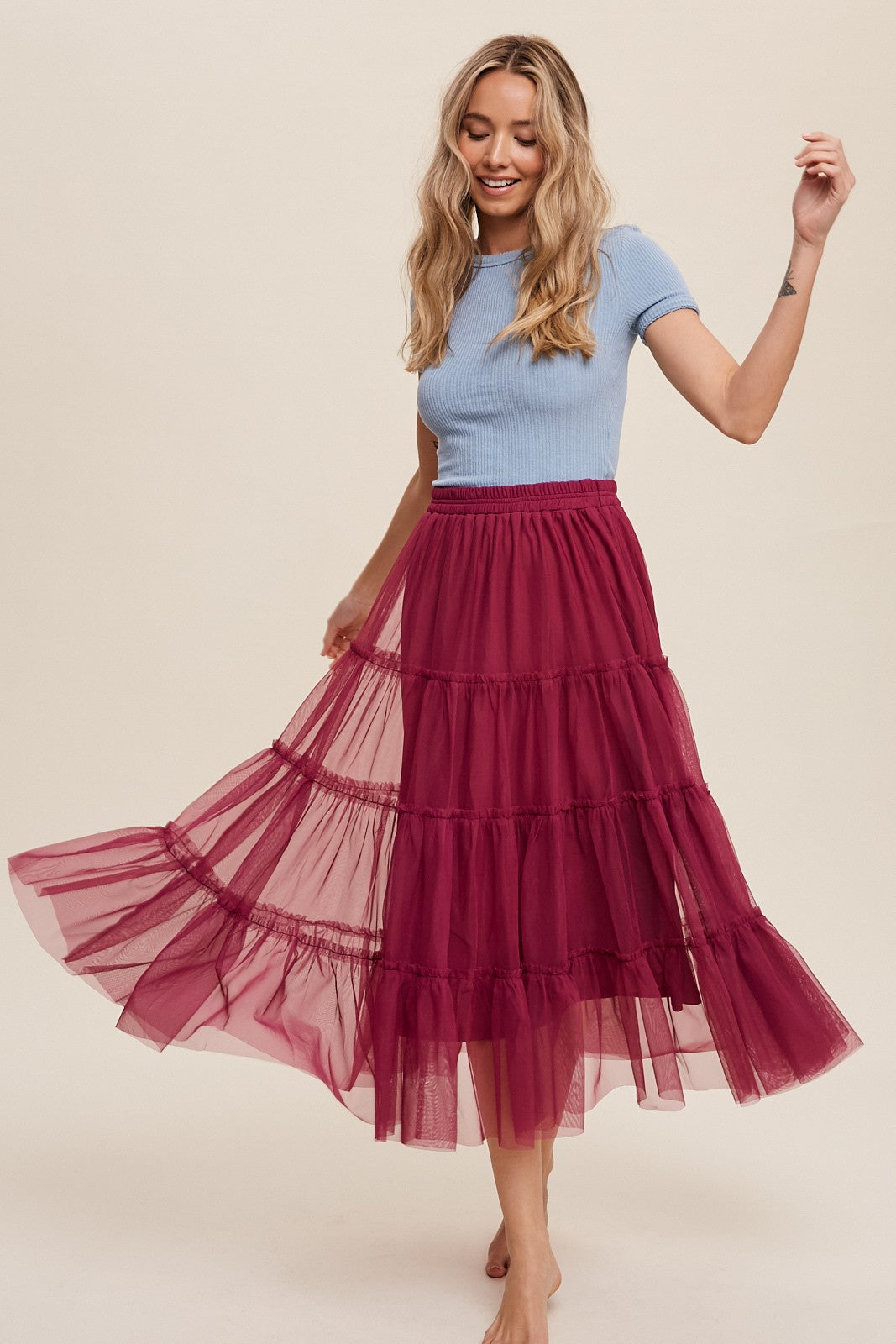 This tiered skirt is an easy piece to dress up for date nights or pair with a Tee and tennis shoes for a casual look. It has an elastic waistband, is lined, and has a raw hem at the bottom.